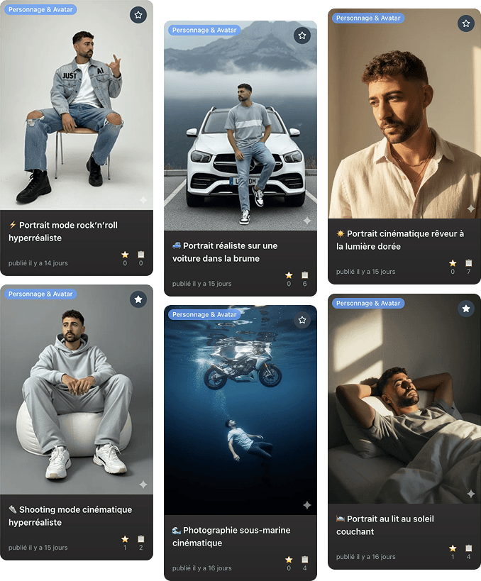 🧠 Classés en 7 catégories : Logos, Publicité, Portrait, Avatars, Illustration, Produits, Art Concept